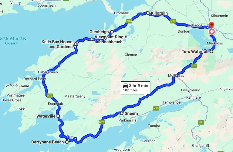 From Killarney to Killorglin by Dingle Bay to Kells House, then transit through Cahersiveen to Waterville. Then via Caherdaniel and Sneem to Torc Falls and back to Killarney.